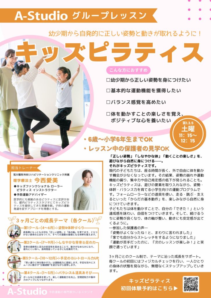 内容:ピラティスに遊びの要素を取り 入れて実践することで、体の基本的な 運動機能を獲得することを目的とする ピラティスです。フォームローラーを 使用することで、特に体幹の安定性と バランス感覚を高めていきます。早稲 田大学の前橋明教授は、基本動作を移 動系、操作系、平衡系の3つに分類し 初歩的運動技能を19動作、基本的運 動技能を38動作にまとめています。近年はテレビやゲームなど画面を眺め るような平面的な遊びが増え、木登り やキャッチボール・公園の遊具などの 立体的な遊びを行う機会が減っていま す。キッズピラティスでは、上下・左右・回転・空間認知(間隔や距離感)、 様々な遊びの中で走る・跳ぶ・押す・ バランスなどの基本動作を意識して発達を促します。