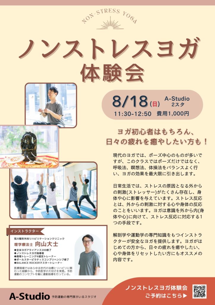 7月29日にオープンした「予防運動の専門家がいるスタジオA-Studio」にて、特別企画「ノンストレスヨガ 体験会」を開催します。