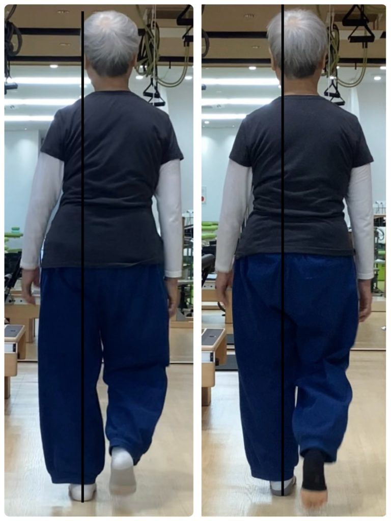 レッスン前後の歩行を比較すると、レッスン後はレッスン前に比べて左足が接地しているタイミングで上半身が真ん中に近づきました。