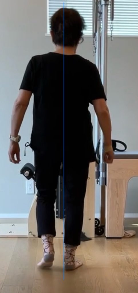背中と腰が丸くなり、側弯もあるため、階段や歩行で、バランスが取りにくい。