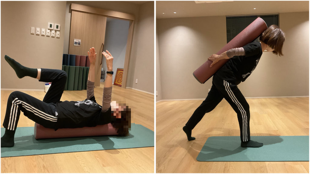 最初はピラティスのエクササイズ中、いつも姿勢の癖が生じやすく、大腿前面の筋肉を過剰に使ってしまうことも多かったので、仰向けでおこなうエクササイズで正しい姿勢を学ぶことからはじめました。